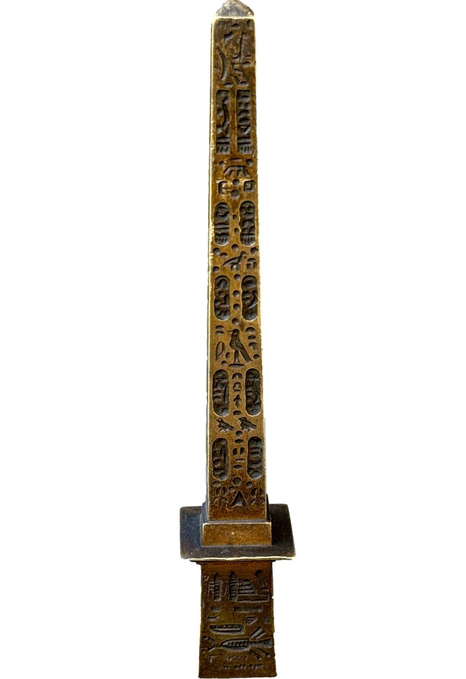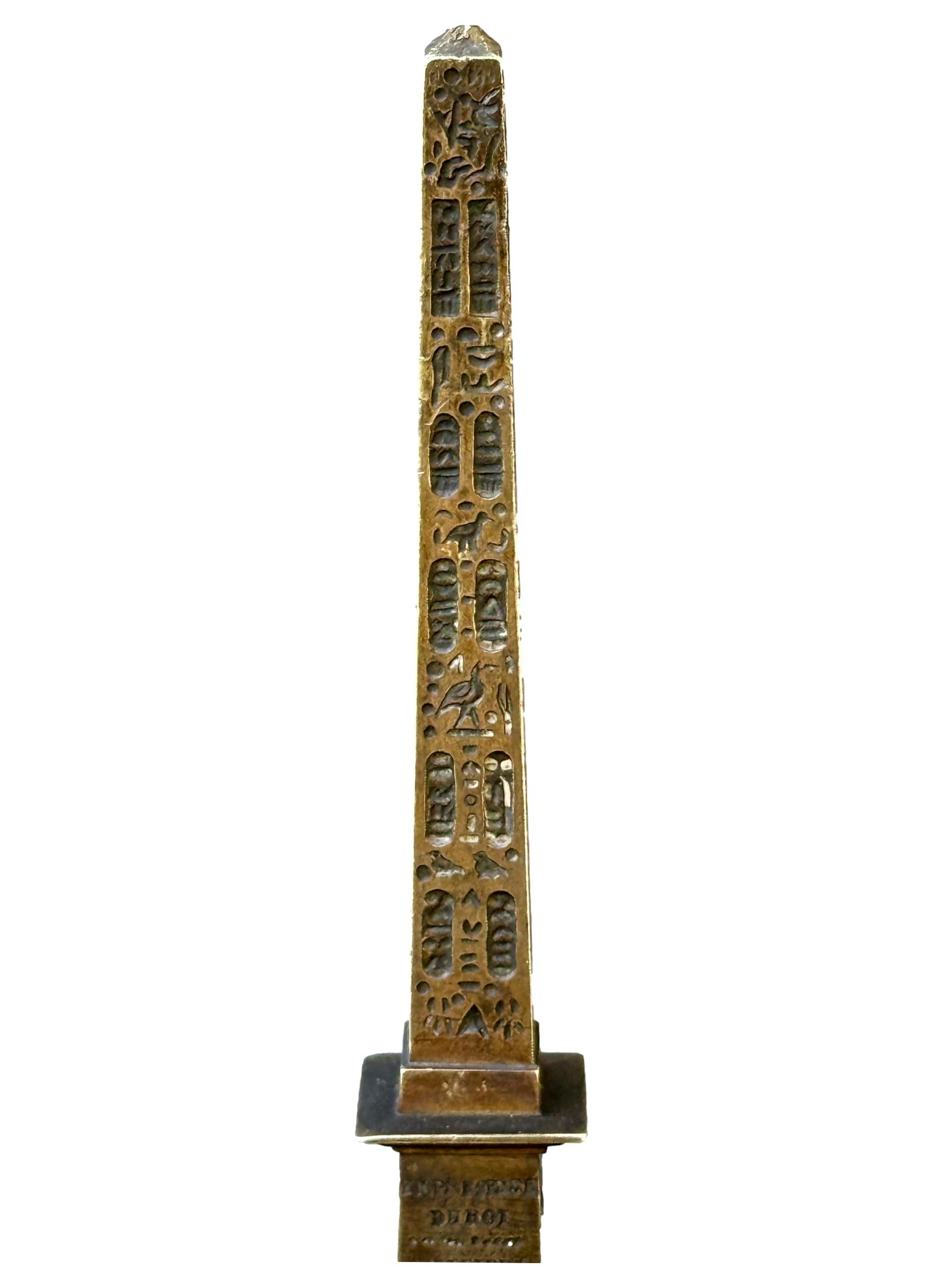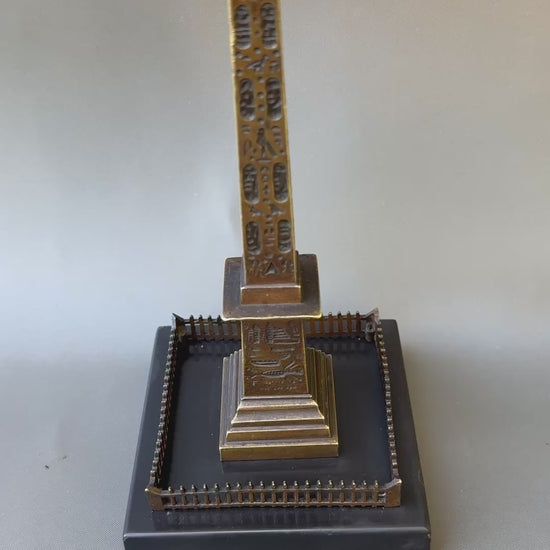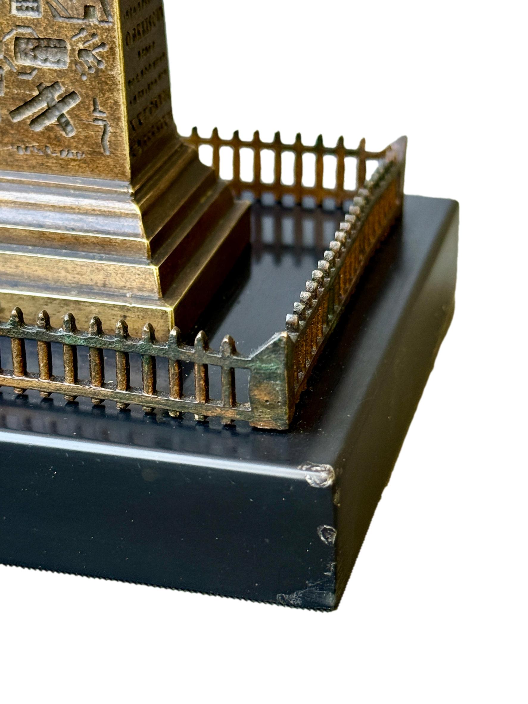 The bronze features beautifully detailed hieroglyphics, a tribute to the original obelisk of Luxor, gifted to France by Egypt. Time has lent it a soft patina, enhancing its authenticity and charm. The black marble base, framed by a delicate bronze fence, adds depth and sophistication to this historical piece.