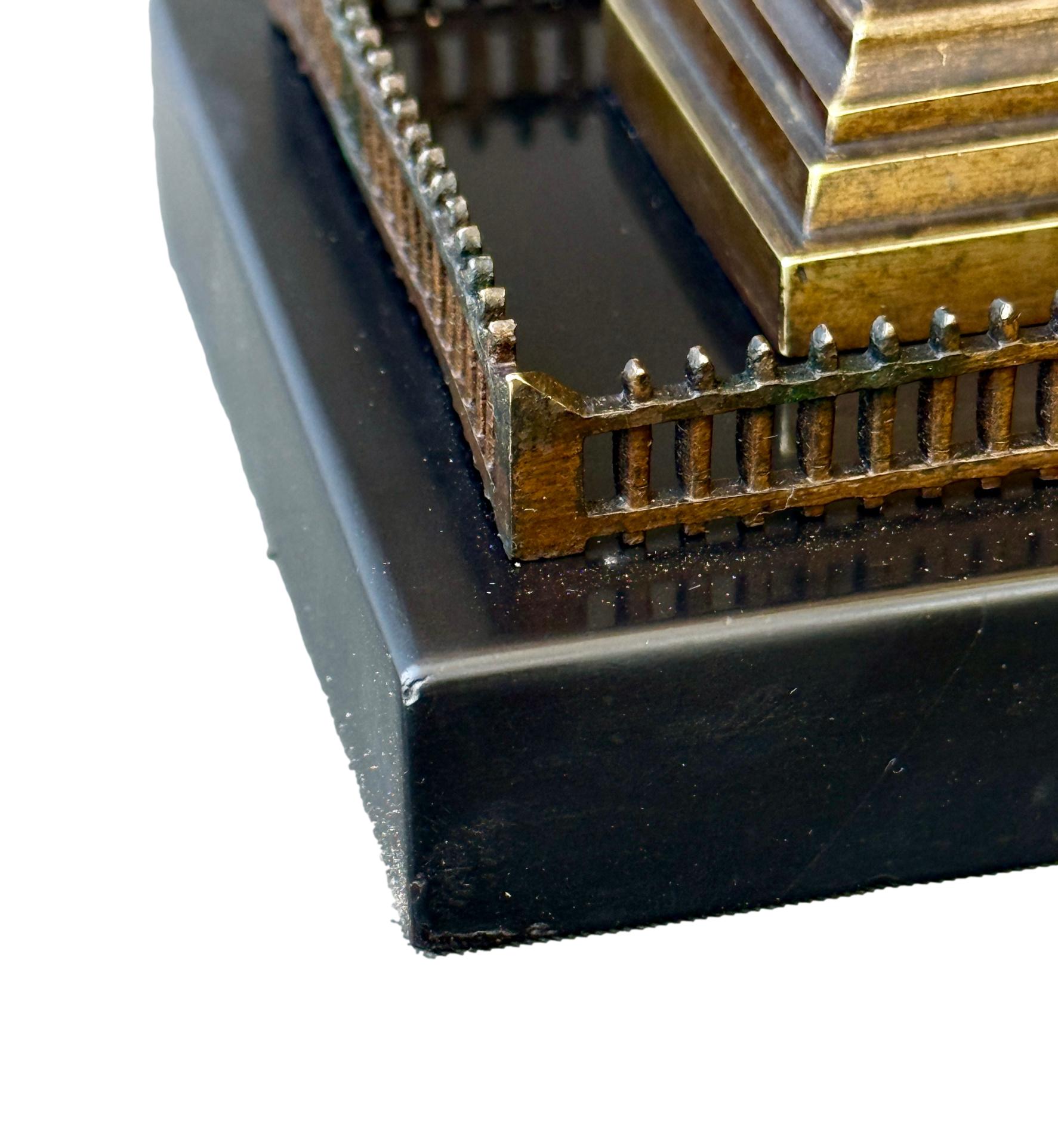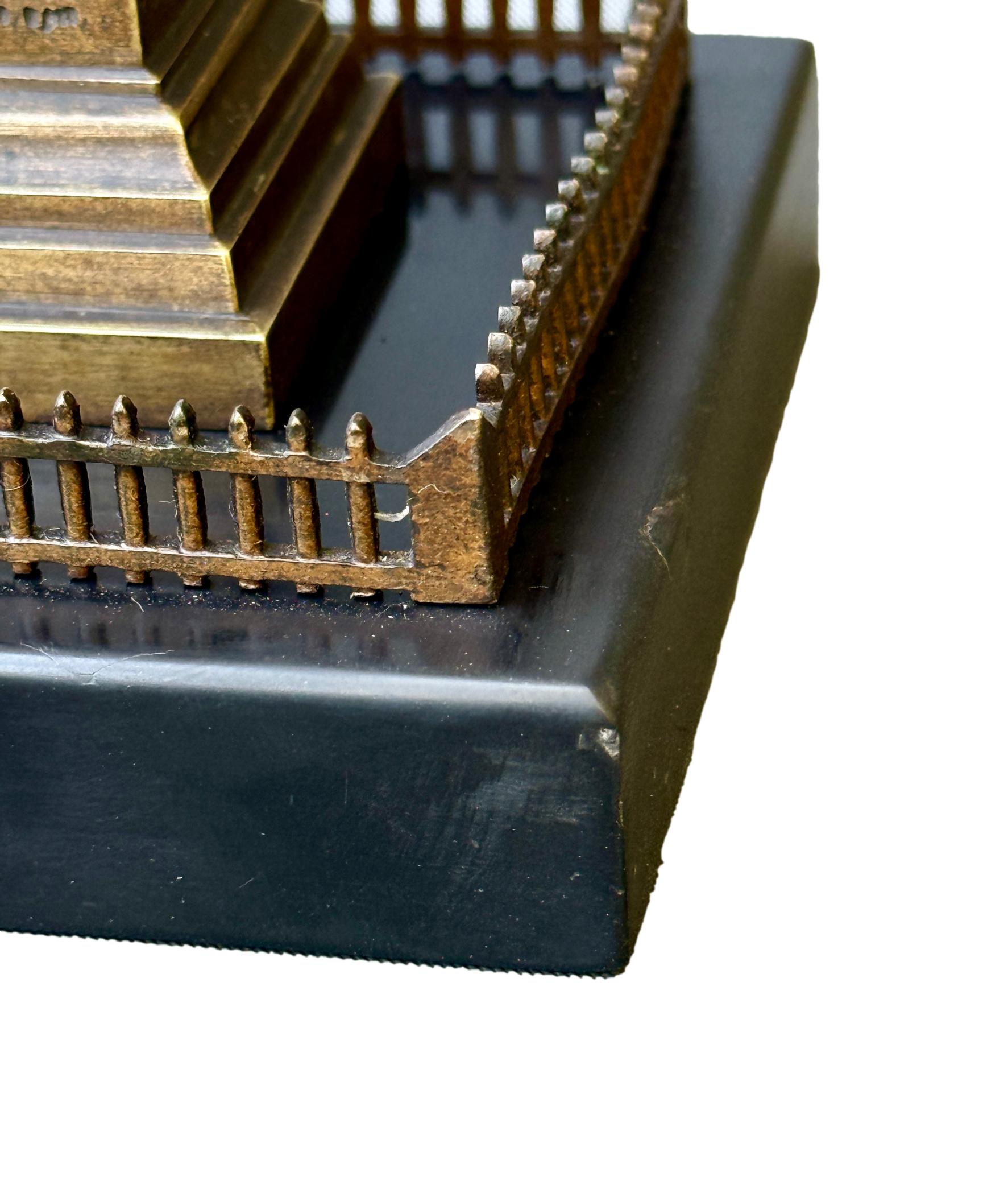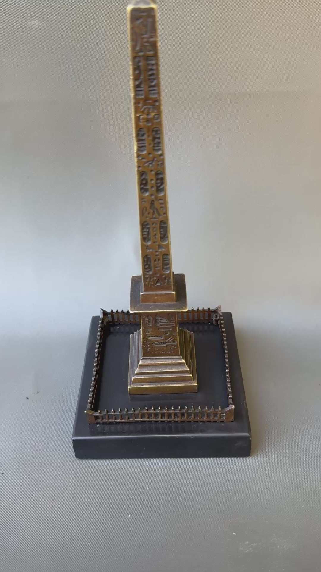 The bronze features beautifully detailed hieroglyphics, a tribute to the original obelisk of Luxor, gifted to France by Egypt. Time has lent it a soft patina, enhancing its authenticity and charm. The black marble base, framed by a delicate bronze fence, adds depth and sophistication to this historical piece.