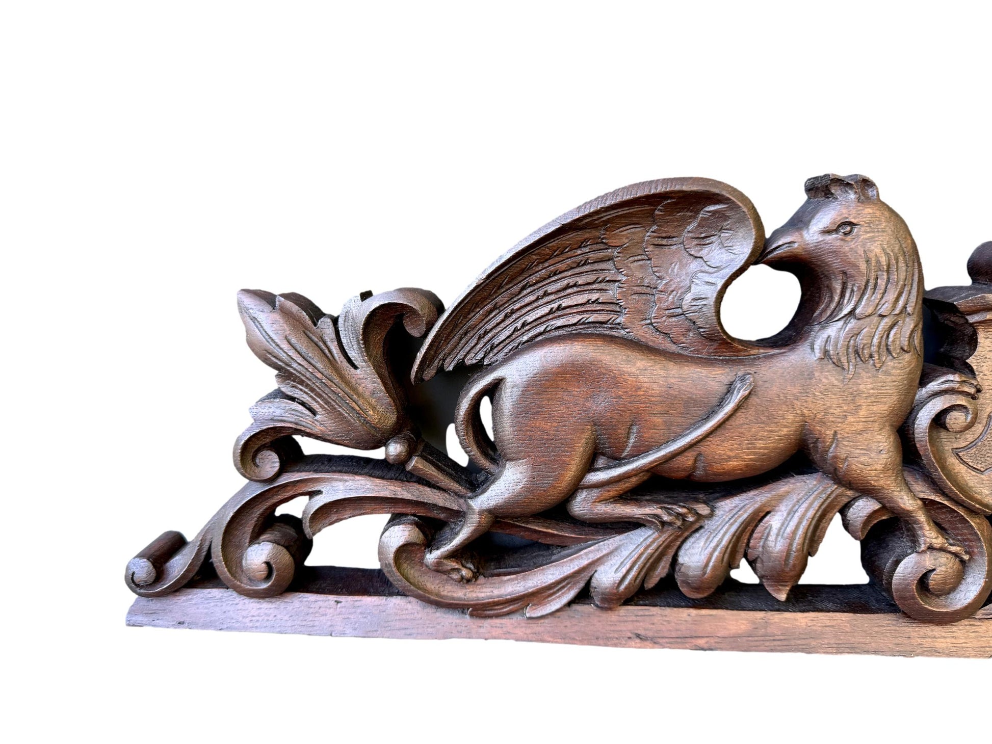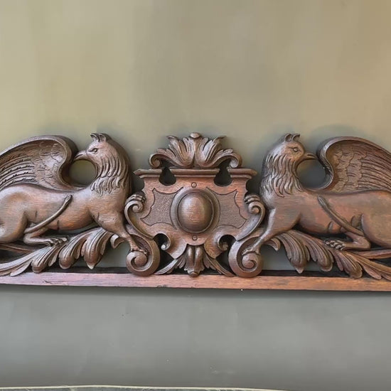 A magnificent 19th-century French oak pediment, entirely hand-carved with two majestic griffins flanking a central heraldic shield. Each mythical creature, half-lion and half-eagle, symbolizes strength and vigilance — timeless guardians from Gothic and Renaissance architectural traditions.