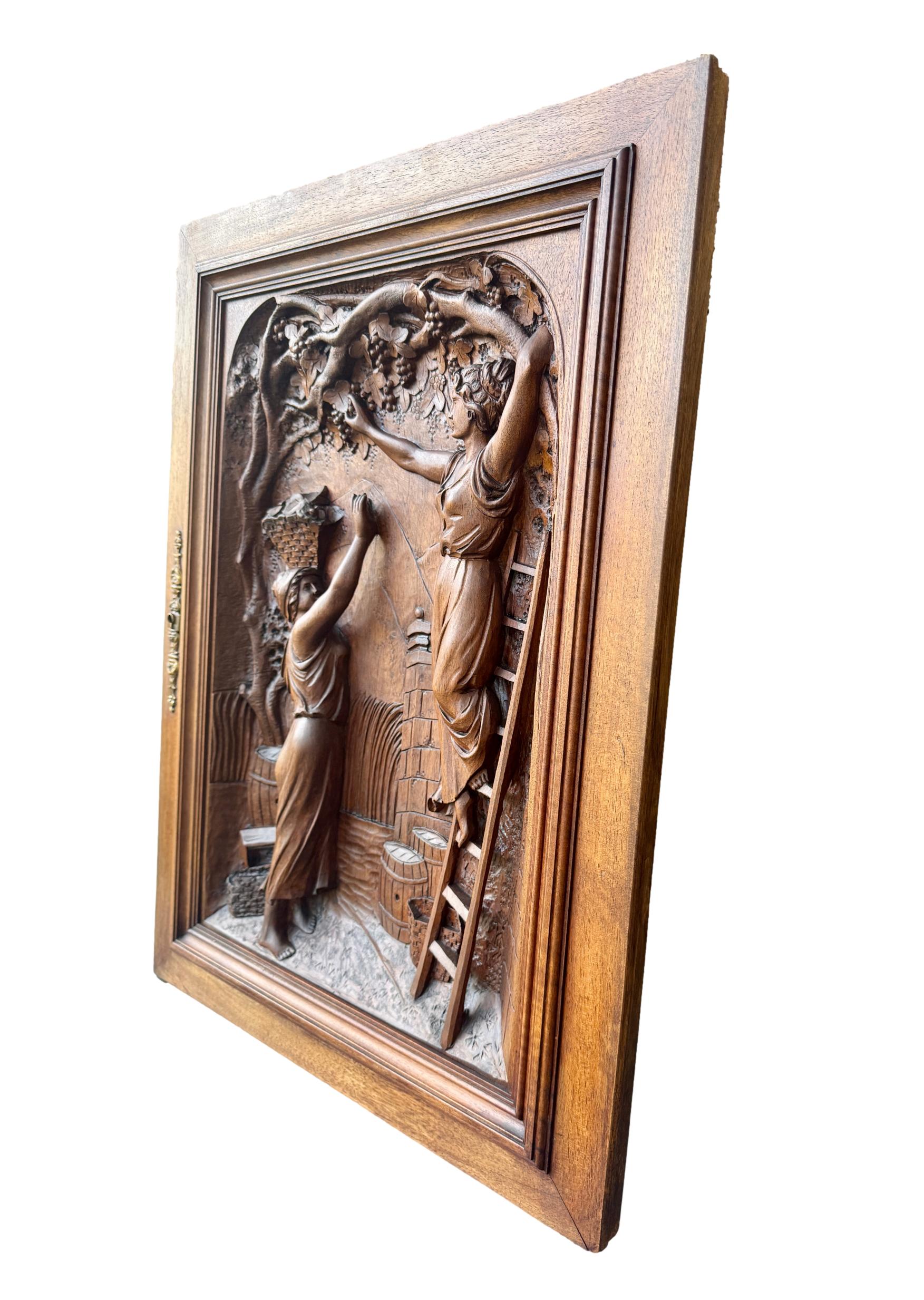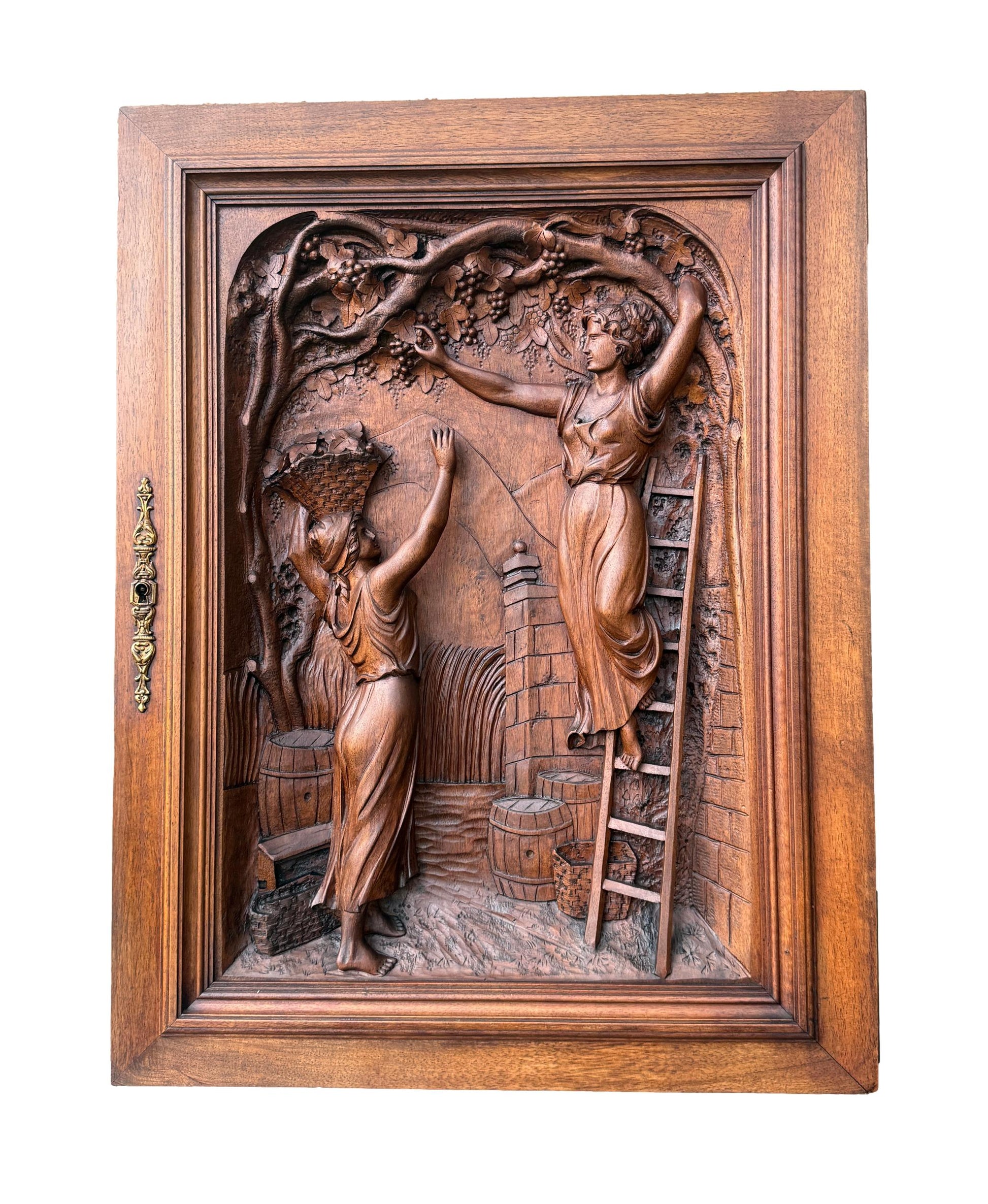 A magnificent 19th-century French carved walnut door panel depicting an elegant grape harvest scene (les vendanges).