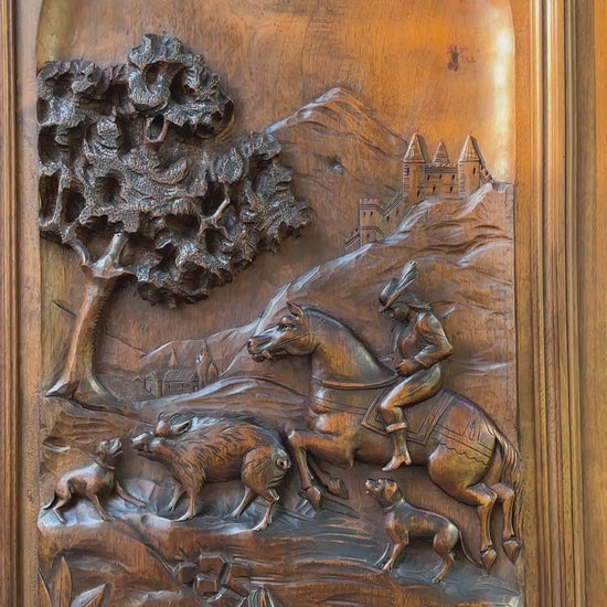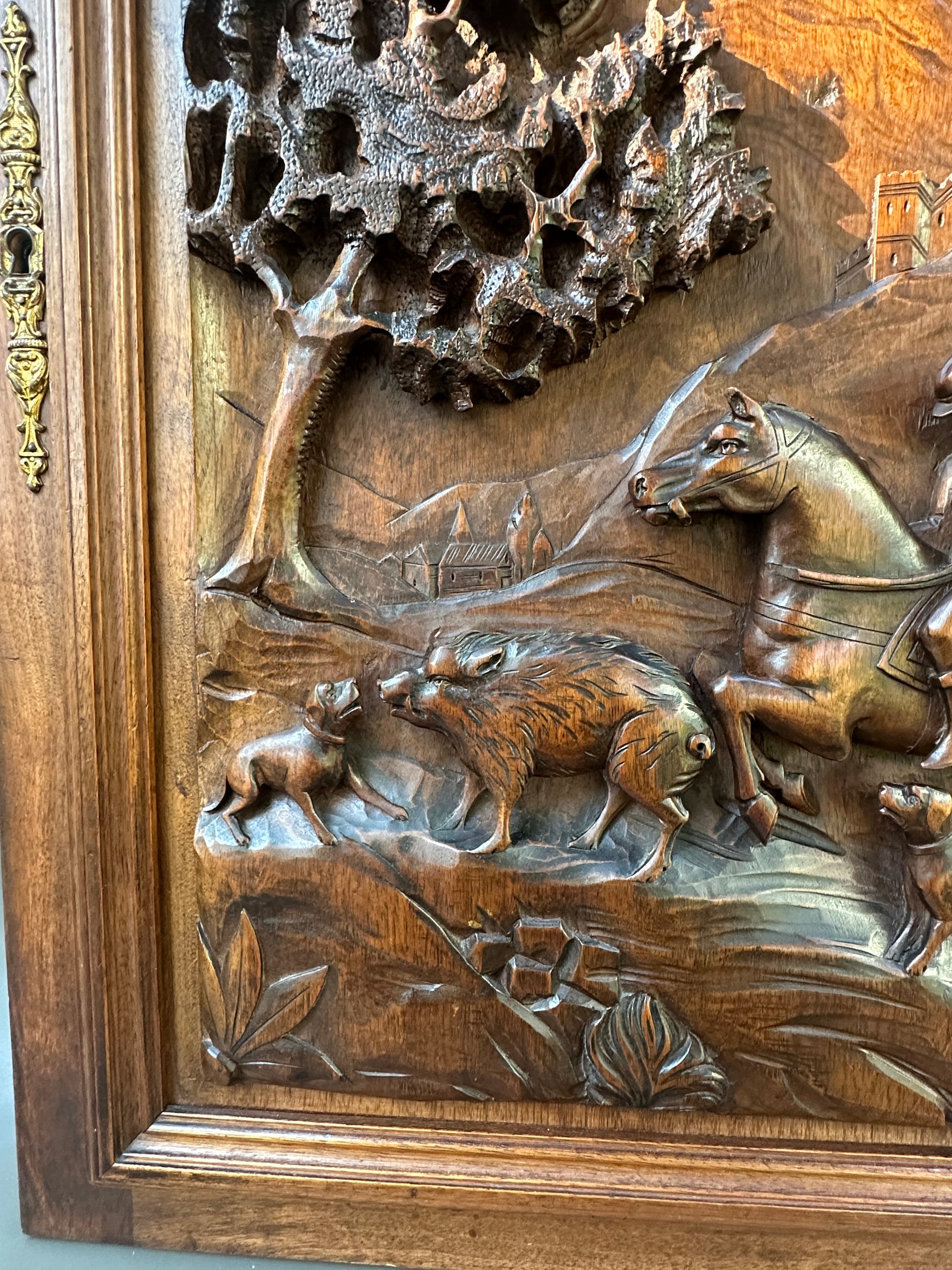 This impressive solid walnut bas-relief panel depicts a mounted hunter accompanied by his dogs, pursuing wild boars in a detailed natural landscape.