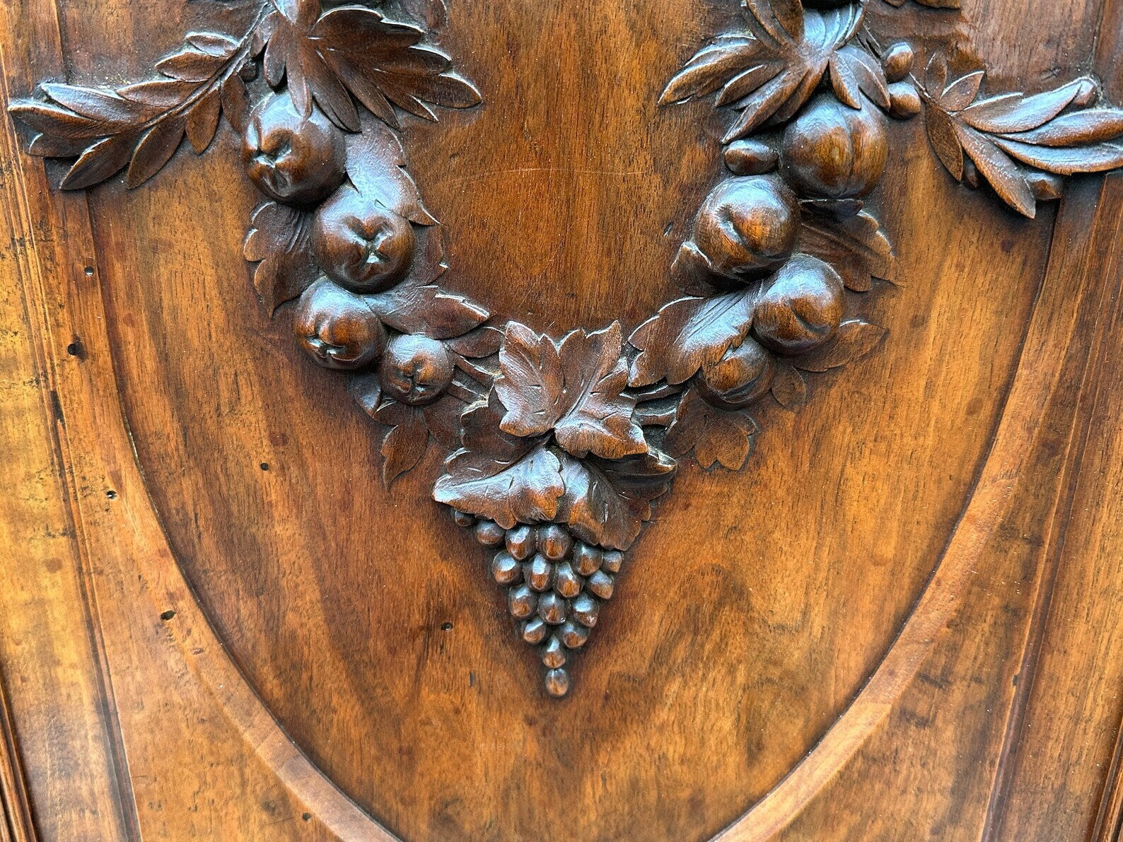This large door is finely decorated with a wreath of fruit, with a pair of birds facing each other above.