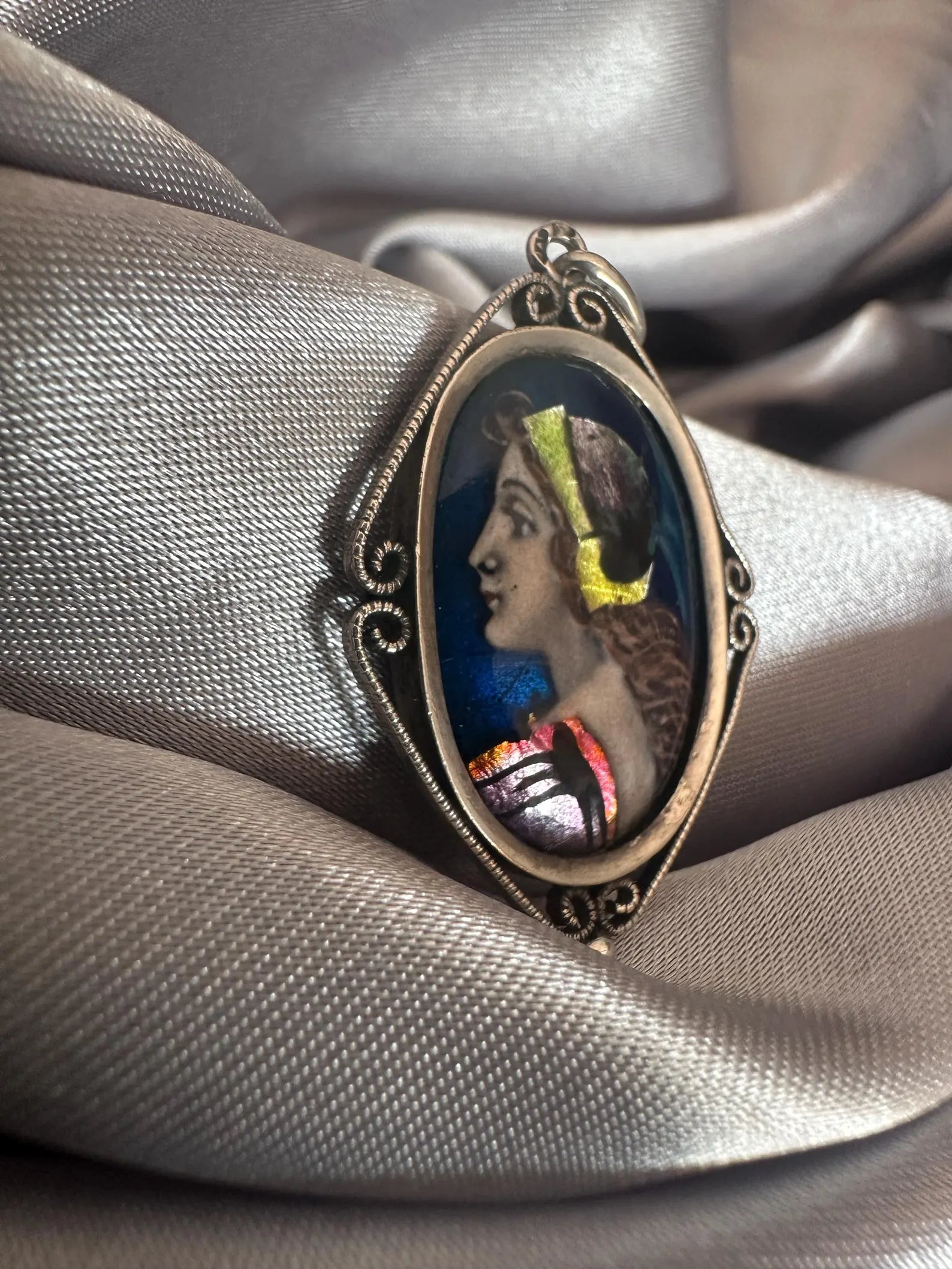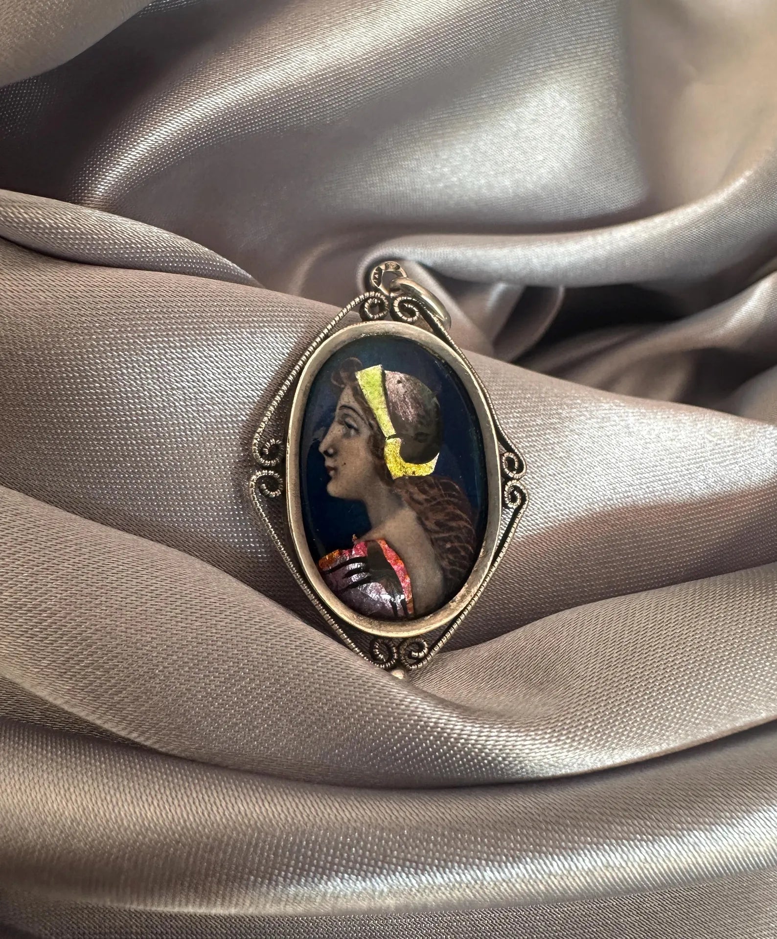 A beautiful hand-painted Limoges enamel portrait pendant, signed Sazerat Limoges, featuring a noblewoman in profile wearing a Renaissance-style headdress. The cabochon is mounted in an ornate sterling silver setting with fine filigree accents.