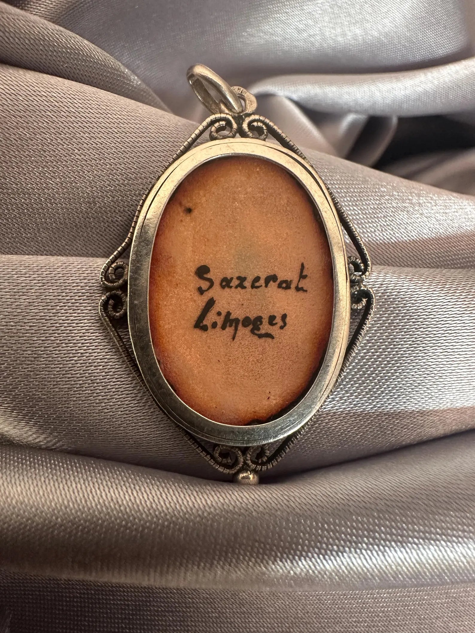 Antique Limoges Enamel Portrait Pendant – Signed Sazerat, Sterling Silver Setting