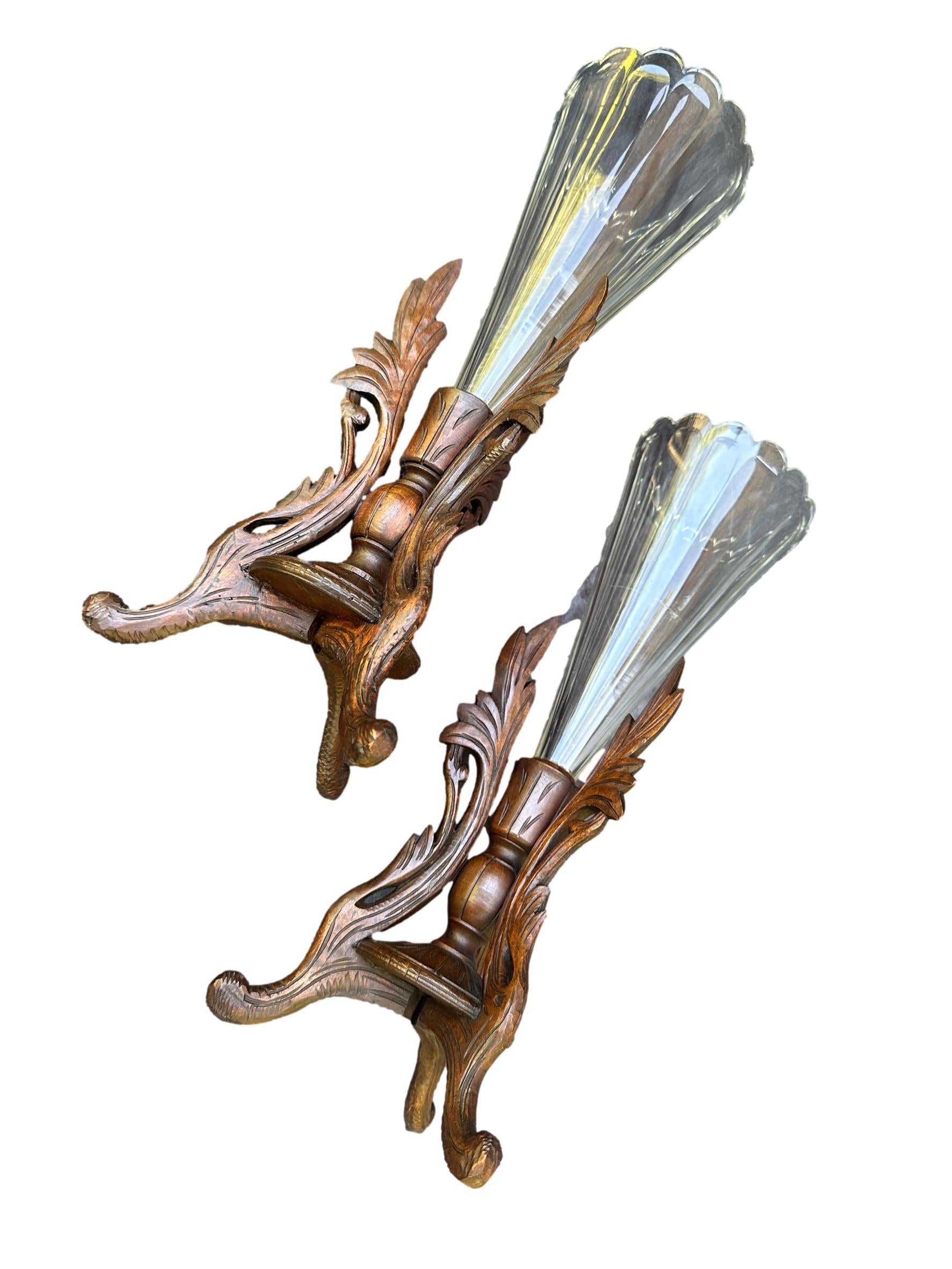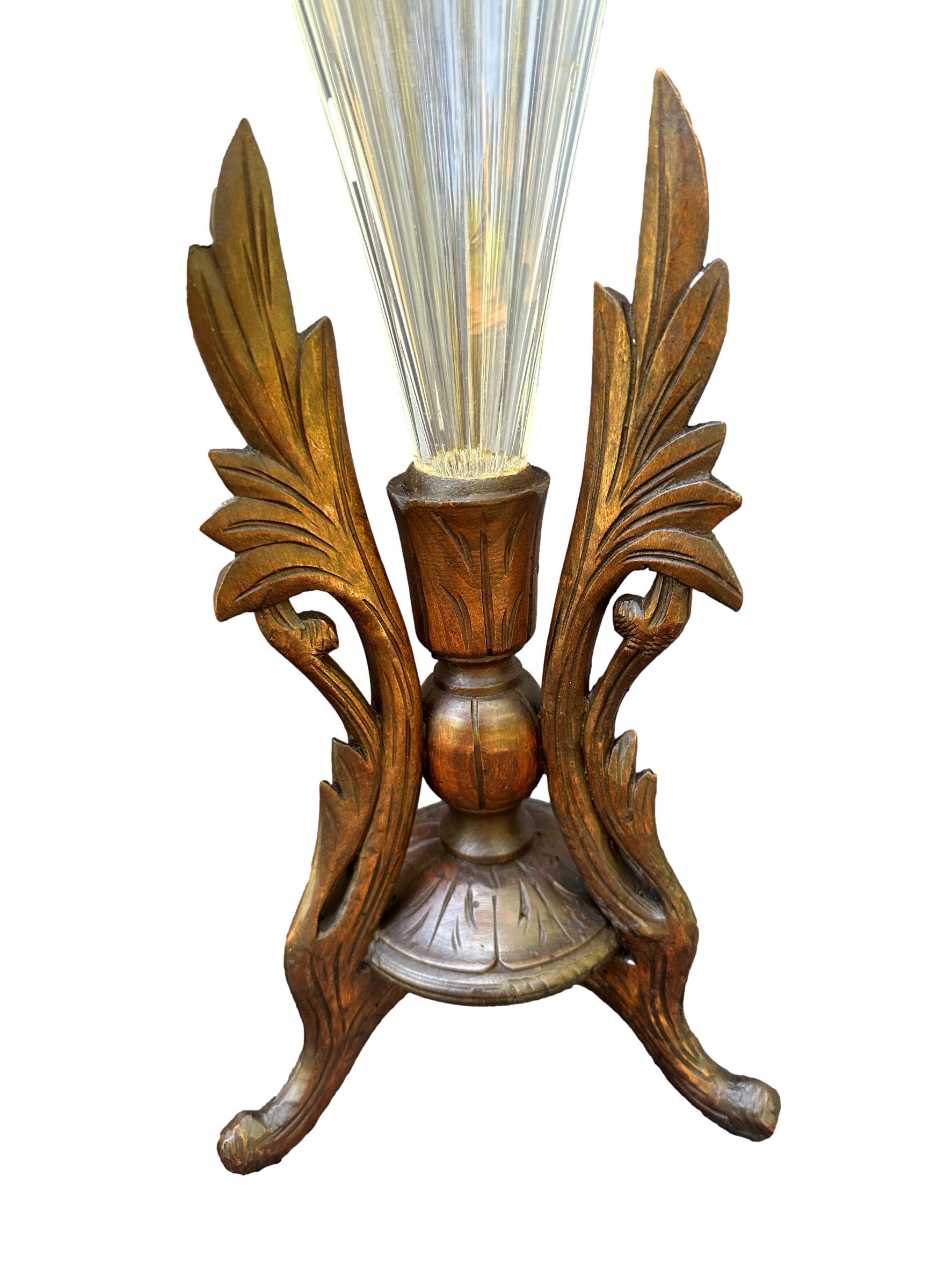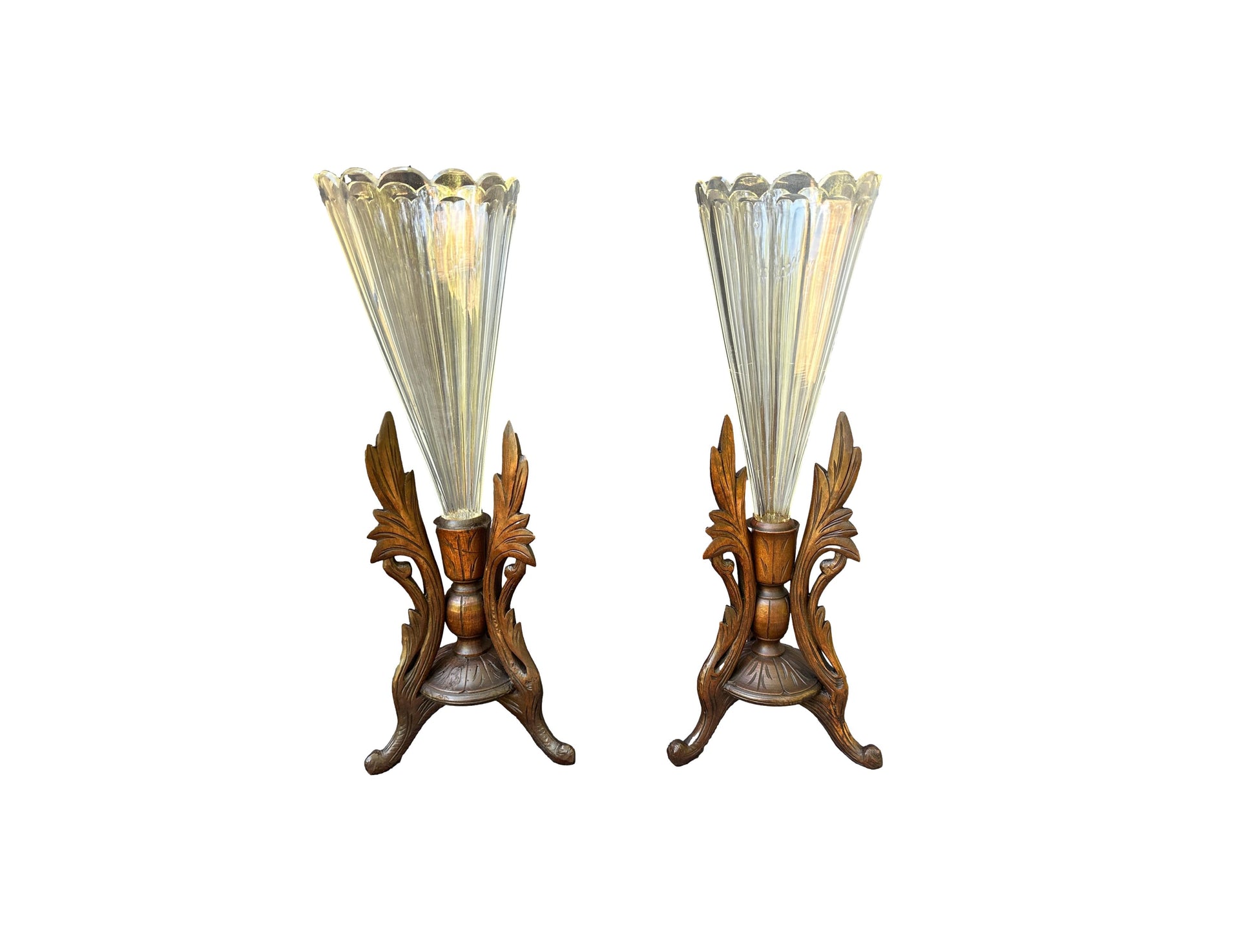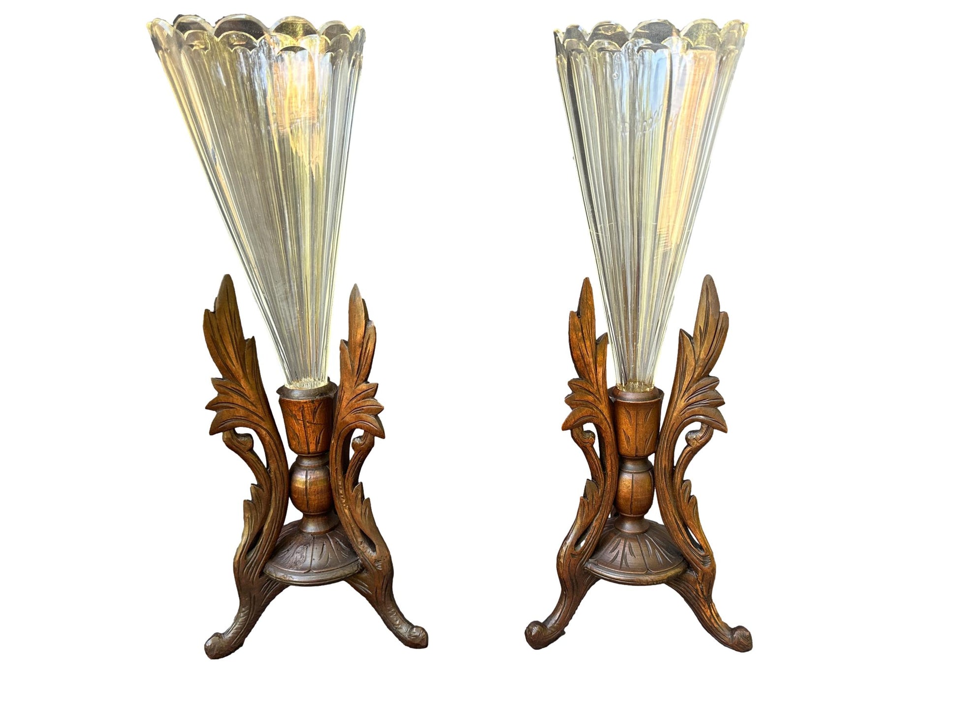 This pair of 19th-century vases is distinguished by its elegance and exceptional craftsmanship. Made from Black Forest carved wood, the vases take on a distinctive horn shape, typical of the region, known for its detailed and refined carvings.