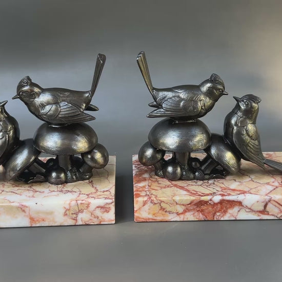 This exquisite pair of 1930s Art Deco bookends features two finely modeled birds perched on mushrooms, sculpted in spelter and marble bases.