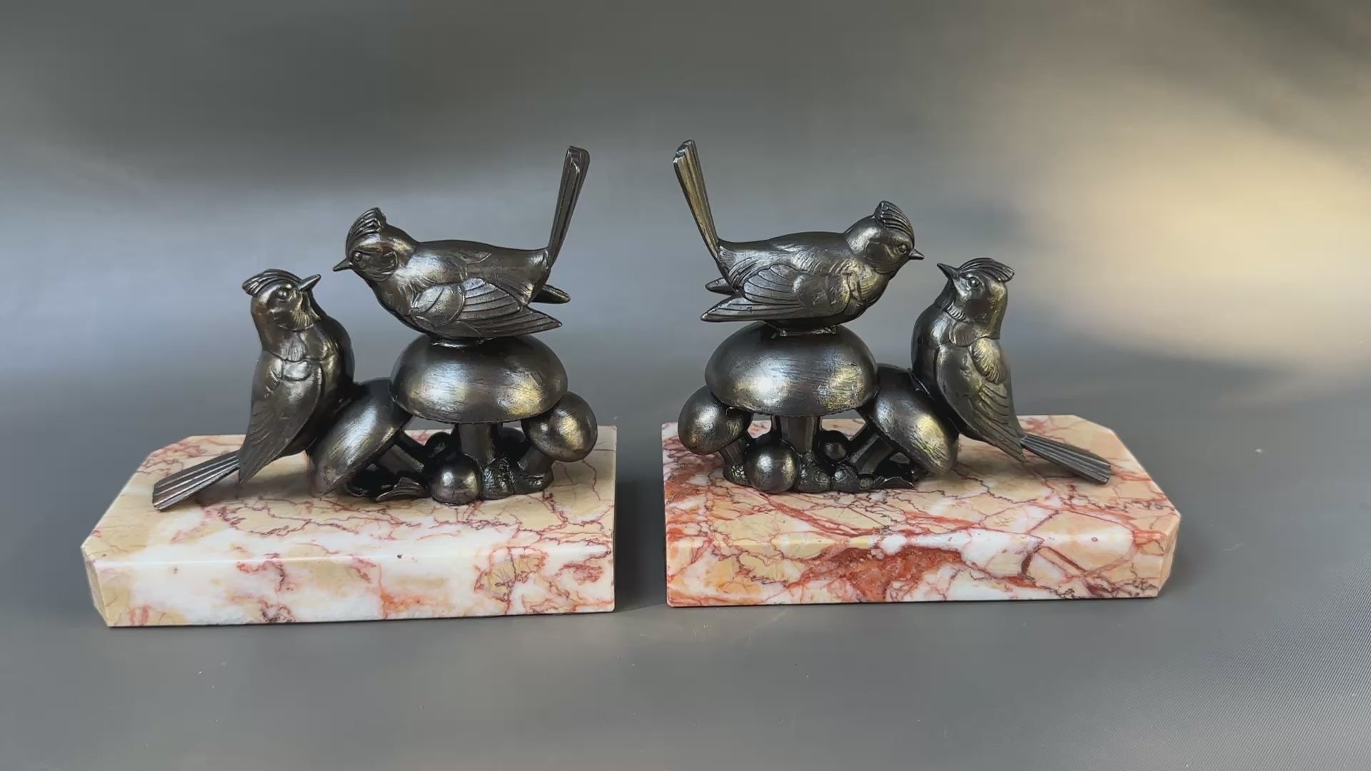 Art Deco Bird Bookends – 1930s French Regule & Marble Birds on Mushrooms