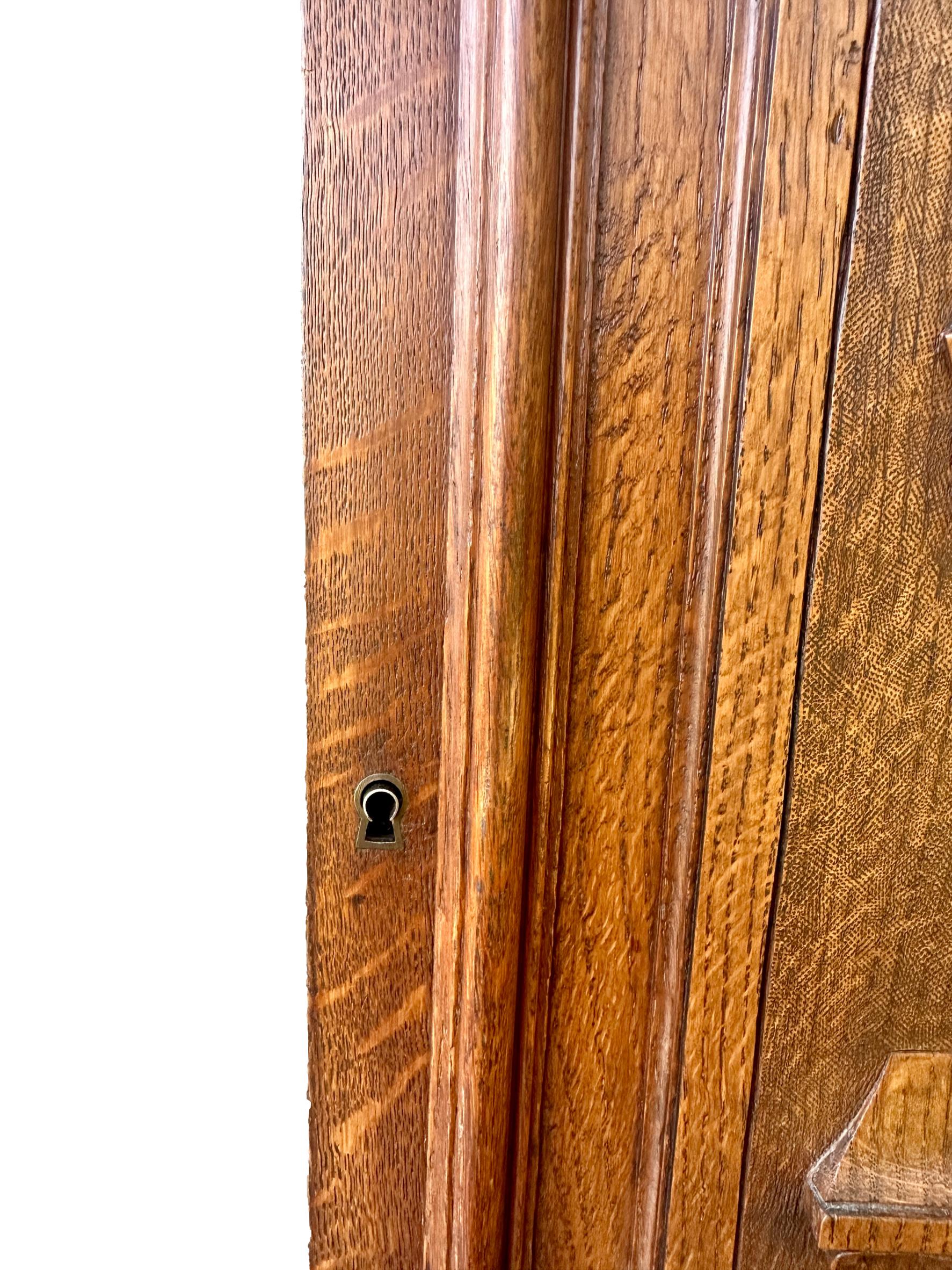 Add a touch of history and elegance to your home with this superb solid carved oak door, dating from the 1900s. Its motif depicts a man in 18th-century garb, finely hand-carved, testifying to exceptional craftsmanship.