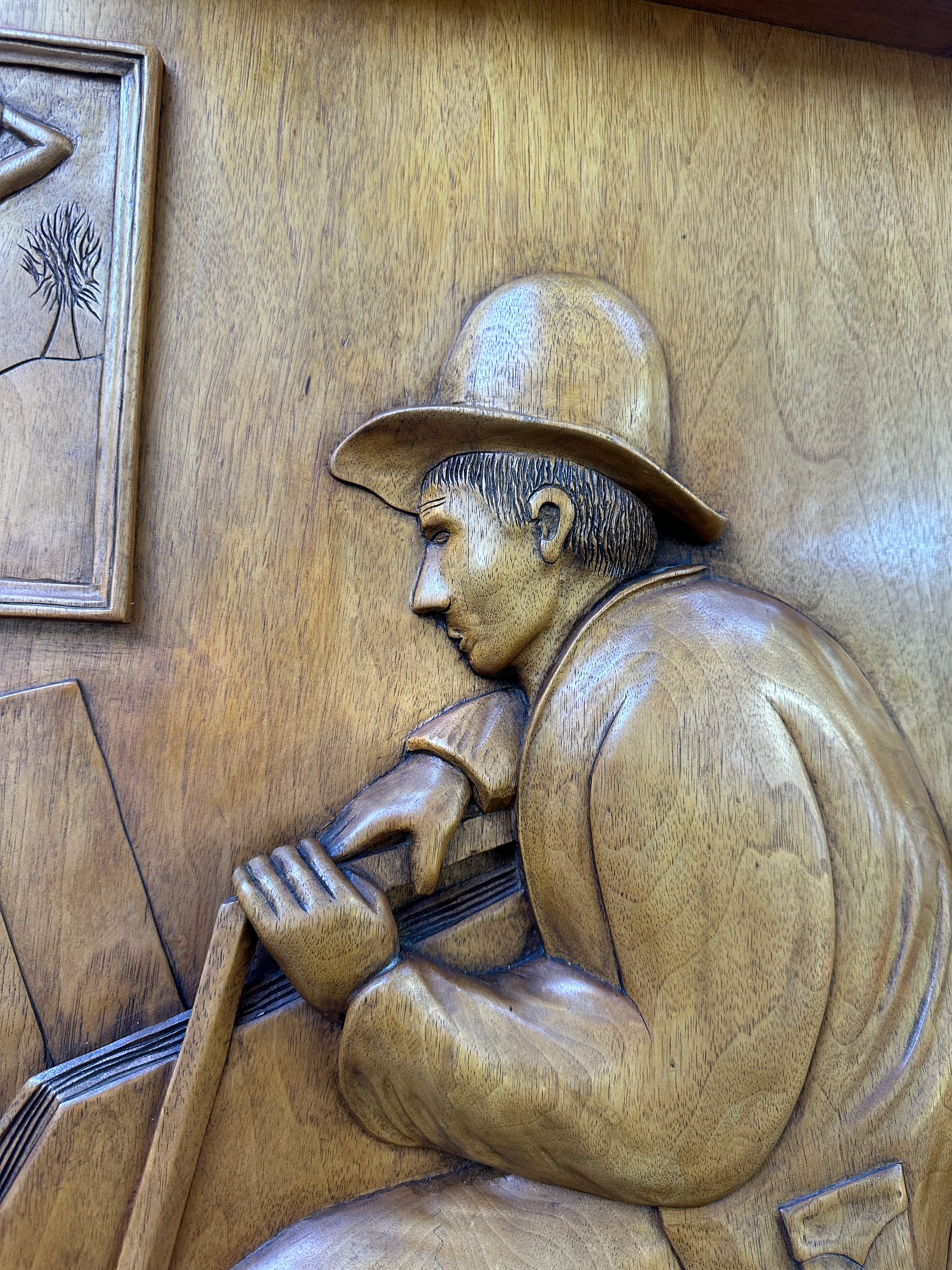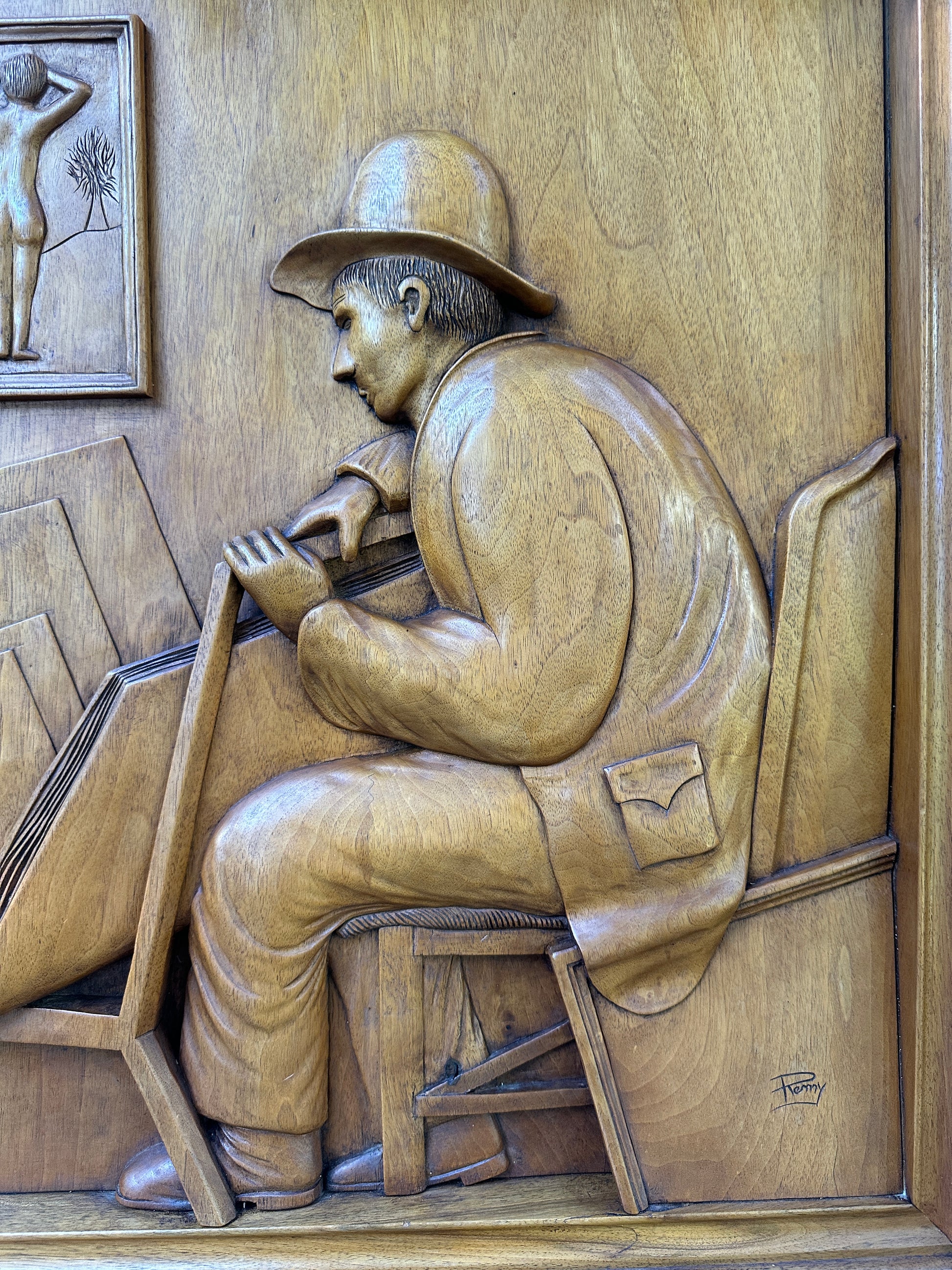Every detail is rendered with care — from the folds of the painter’s jacket to the textures of his chair and drawing boards. The depth of the carving, the warmth of the walnut grain, and the play of light across the relief create a captivating sense of life and movement.